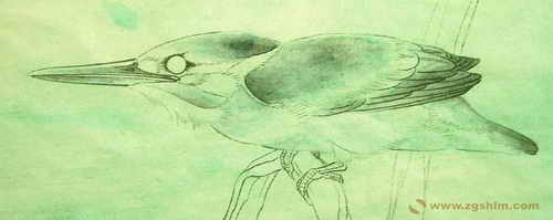 墨青分染鸟背部,淡墨统染飞羽、复羽部分。淡淡的花青分染胸、腹部。中墨分染嘴。上嘴从根部往尖部染,下颌相反。