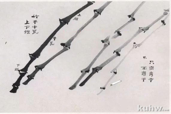 ②竹节上下长短不等,节弯,干不弯,这些自然规律,画时应予以重视。诀曰:竹干中长上下短,只须弯节不弯干。