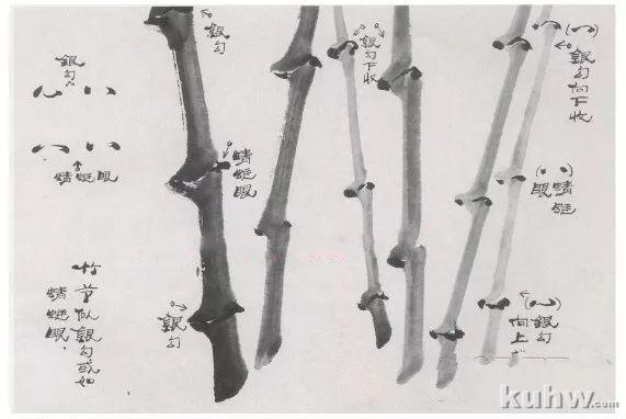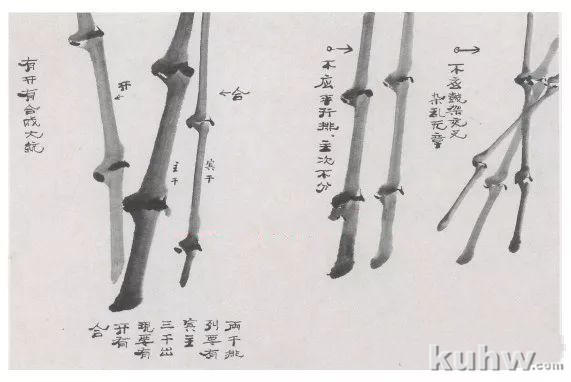 画枝要劲健挺拔,行笔疾如草书,起手三笔如鱼骨,三笔中有出节枝(主笔)、结顶枝与出梢枝,大凡一节出两枝,不必节节出枝。诀曰: