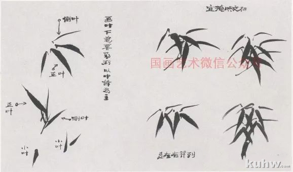 ①画叶是画竹的重要一环,下笔要劲利,以中锋为主,叶子形尖不似芦,细不似柳。画一组叶子要注意每个叶子的透视变化,即有肥有瘦,有长有短,有面有点,最宜掩映以交加,切忌比联而重叠。
