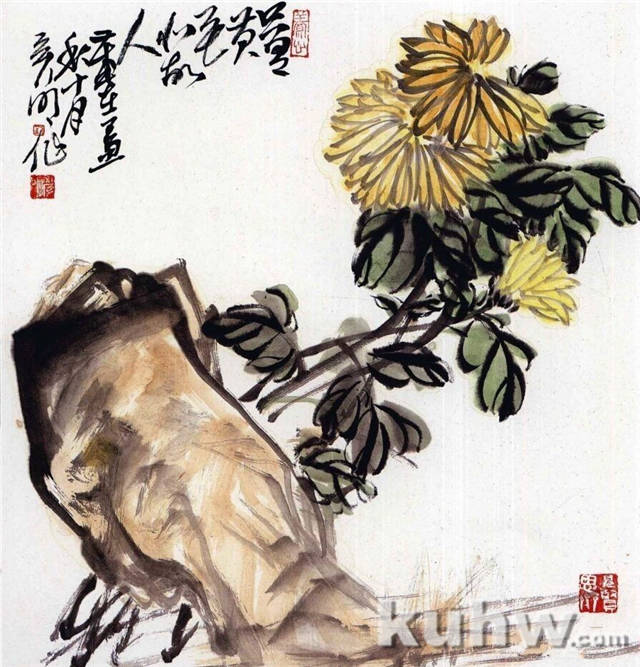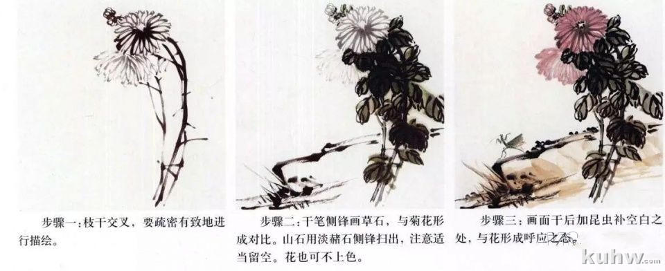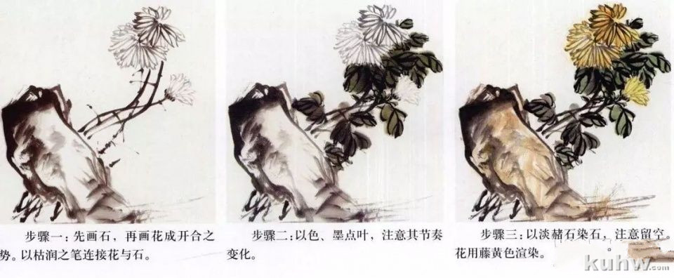步骤一:先画石,再画花成开合之势。以枯润之笔连接花与石。