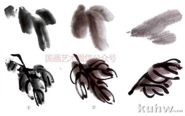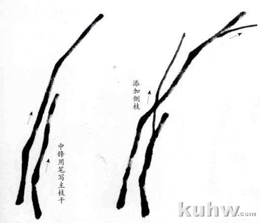 先出枝,后添叶,注意浓淡干湿变化,疏处墨淡笔虚,密处墨浓笔重。↓↓↓