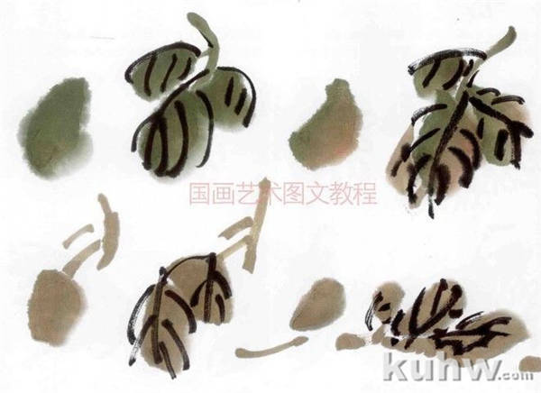 勾叶筋时中锋用笔,顿挫有力,勾勒时宜沿着叶子的走向,不必过于拘泥。↓↓↓