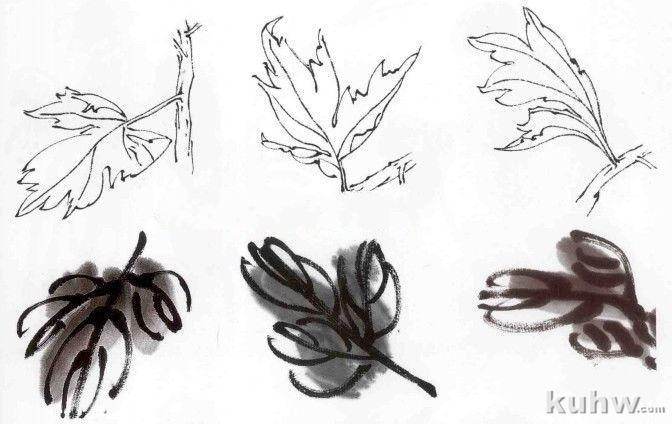 菊花的叶子为五出叶的一种,菊叶宜用侧锋画出,笔尖墨浓,笔根逐渐变淡,正面叶一般画四、五笔,侧面叶一般画两至三笔,用笔以顺势方便为原则。菊叶可分为下垂叶和上仰叶,一株菊花中往往依据构图需要和客观形态进行巧妙组合。