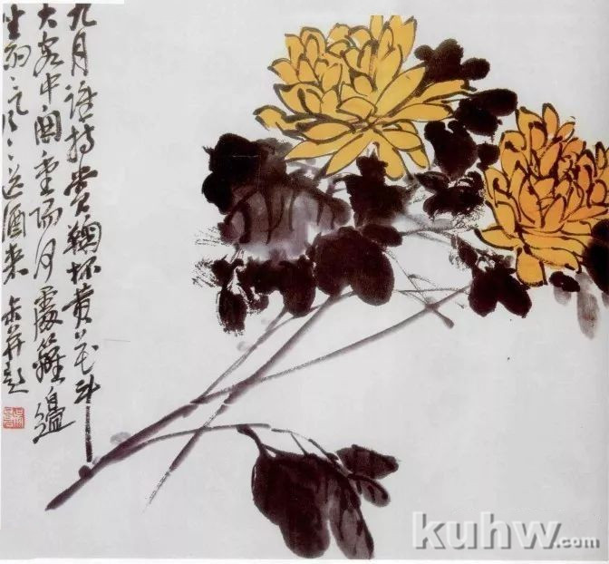 调藤黄和朱 ,从瓣心向外依次填染,水分要大,临习时须观察到吴昌硕设色的微妙变化。↓↓↓