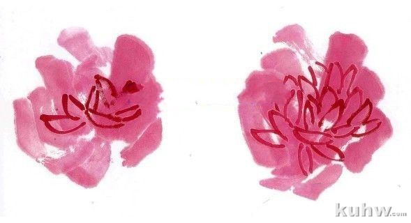 第二步:用浓胭脂色,双勾出花瓣,注意花瓣之间的前后遮挡、穿插。↓↓↓