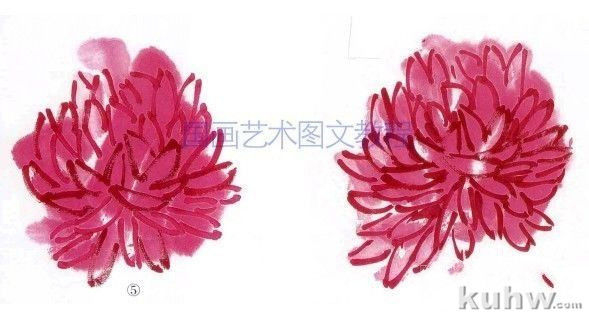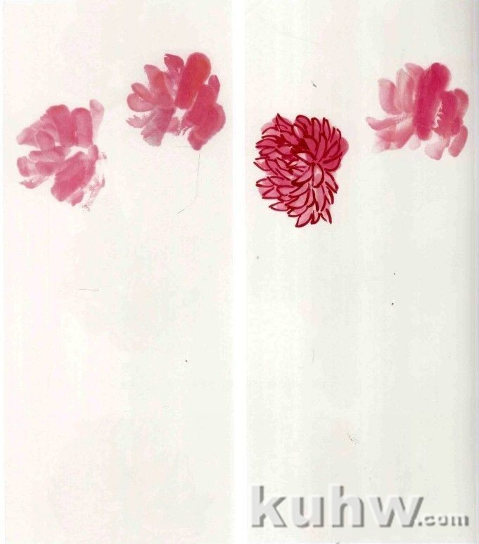 用笔调曙红和少许胭脂,水分宜大,侧锋用笔,用没骨法画出菊朵的轮廓。↓↓↓