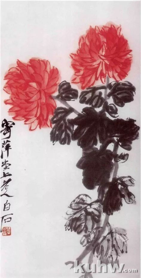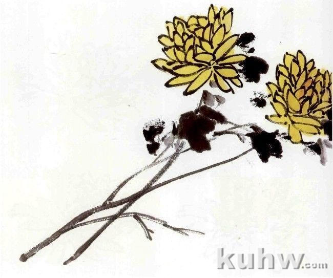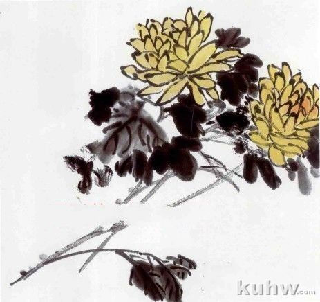 第三步:添加枝叶,注意原作菊叶形态上的正侧、疏密及墨色上的浓淡、枯湿变化,穿插枝干用笔宜柔厚,忌霸悍。