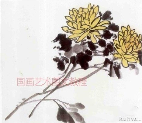 第一步:在画幅上端,依前面分解图示,先染出两朵菊花花形。