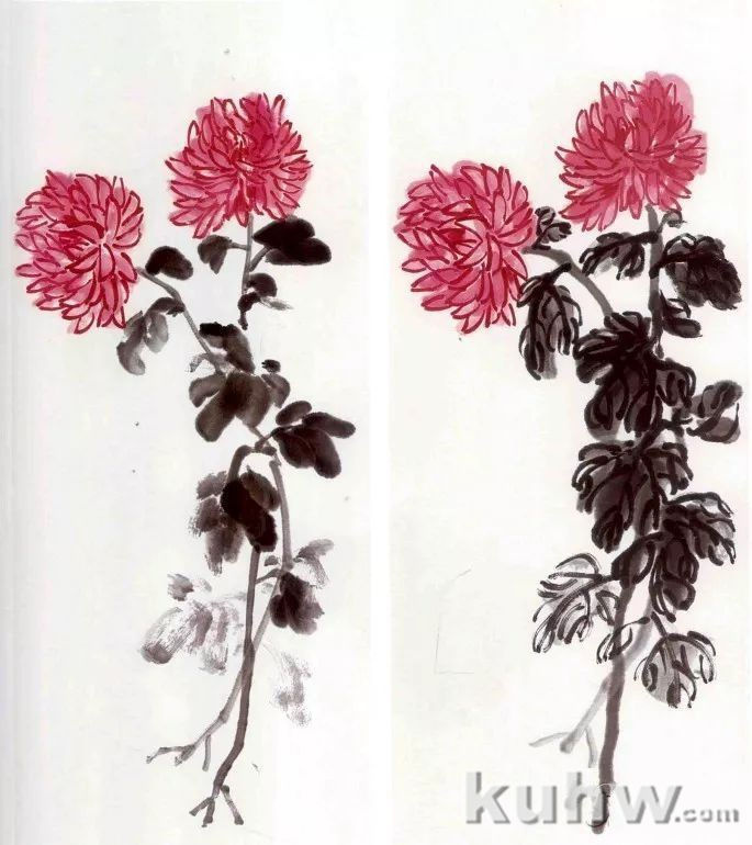 第四步:在前一步点 菊叶的基础上继续添加枝叶,注意观察原作的笔墨变化。↓↓↓