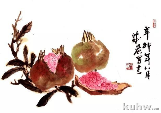 步骤二:羊毫笔重新调好颜色,同样中锋勾出法瓣,侧锋用笔画石榴果体部位。调色时笔中三绿多一些,和前面的石榴颜色形成既有对比又有呼应的关系。
