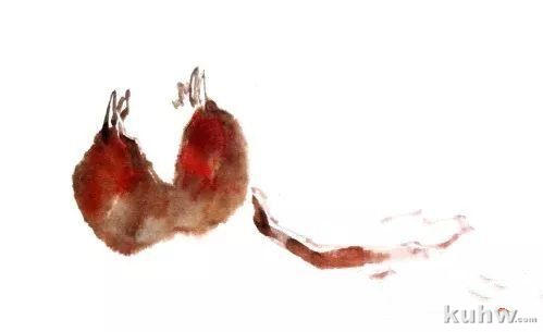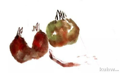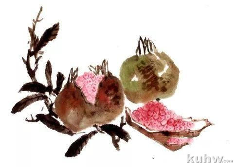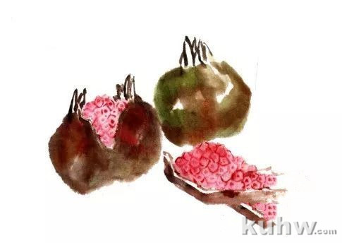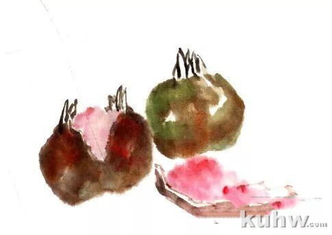 步骤一:用较大的羊毫调色,朱 加墨,调入少许三绿,笔尖扫一点重墨,中锋用笔先勾出石榴上部尖瓣,顺势侧锋用笔画出裂开的石榴皮。下面小半截石榴同样用中锋勾出形,侧锋画出石榴皮。
