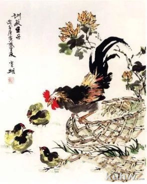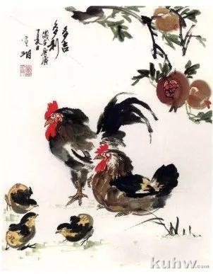 群鸡作品是人们喜闻乐见的形式,画群鸡要注意构图上的疏密聚散,笔墨上的浓淡虚实,构成上的神态呼应关系,色彩上的色调的统一与变化。