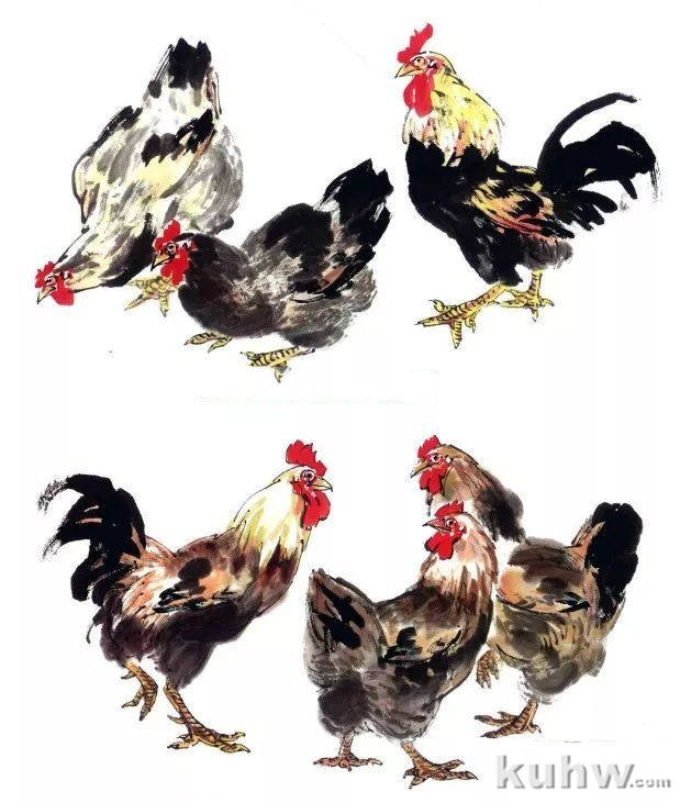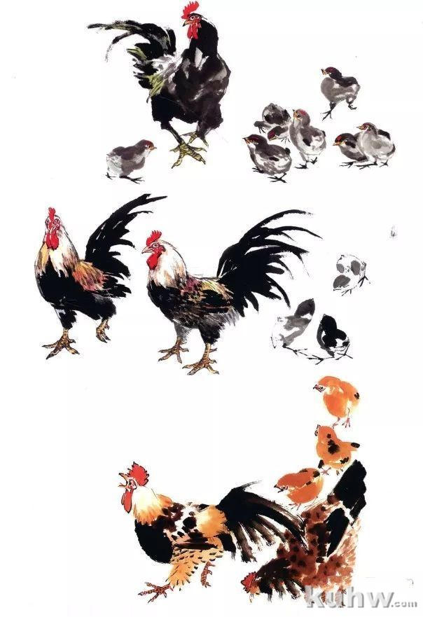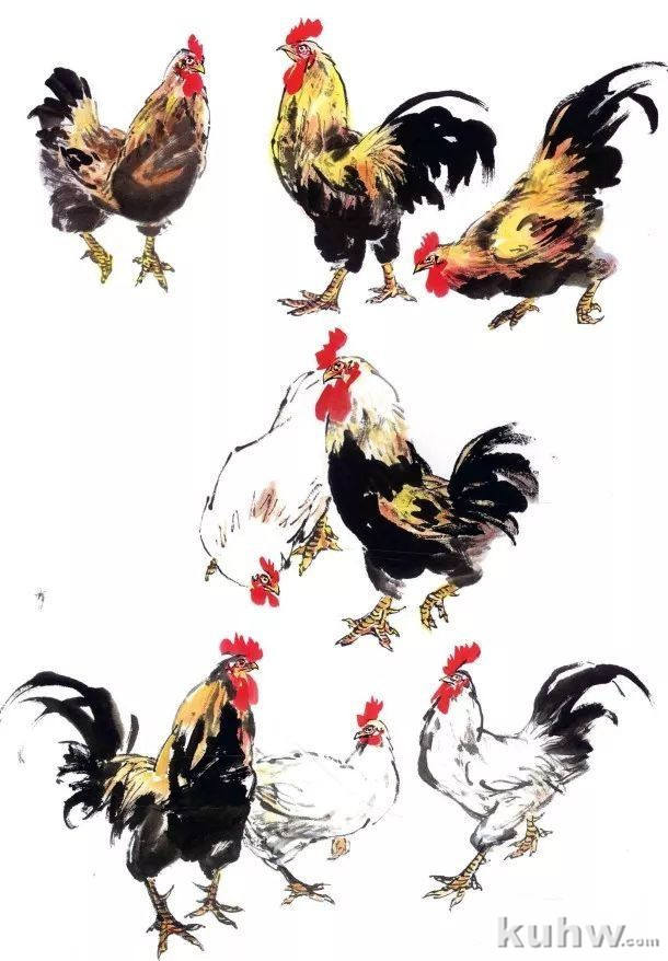 初学画鸡应以写实入手,要在生活哆画鸡的速写,如任伯年的鸡千姿百态无类同,形神兼备,色彩丰富,均是从写实中来的。