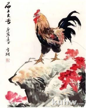 石上大吉:以大公鸡站立在石头上,因“石上”与“室上”谐音,寓意室上大吉,平安无事。此画配上鸡冠花,“冠”与“官”谐音,寓意升职晋级。