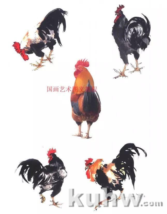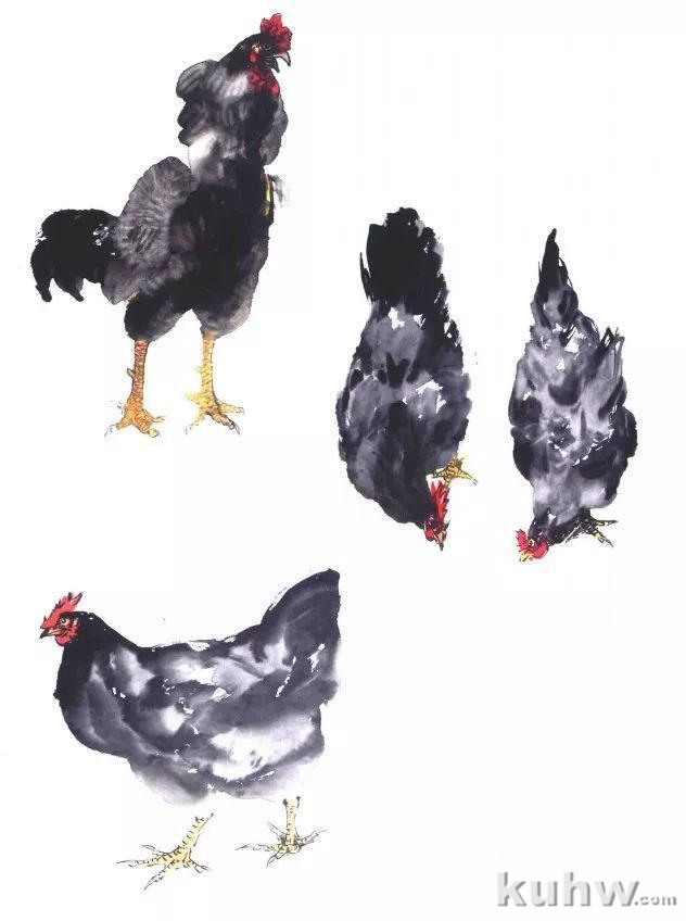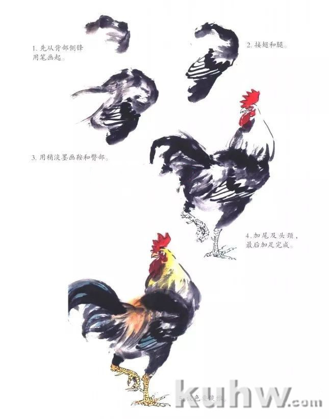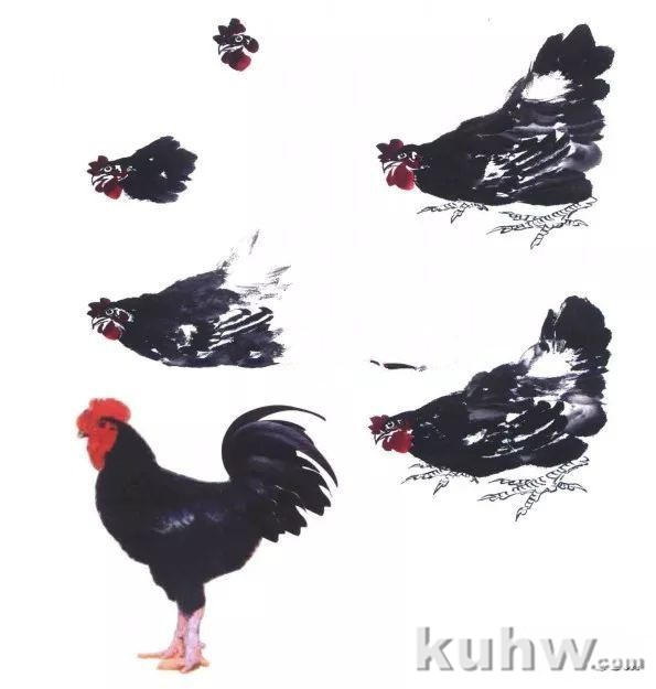 1.喙、眼、耳用浓墨勾出,冠以朱砂加胭脂画出,再用较大的毛笔调墨,笔尖浓笔肚浅,从头画至颈部,颈羽要显出浓淡变化。背及鞍部可用叠瓦法画出羽毛的感觉。鞍部一定要淡。画出翅部。再画胸腿,要显出笔触,墨色要有变化,忌平涂。尾部应用浓墨,干湿相宜,大胆挥写,如兰叶交叉。足爪用浓墨精心刻画,充分表现鸡的刚健有力。