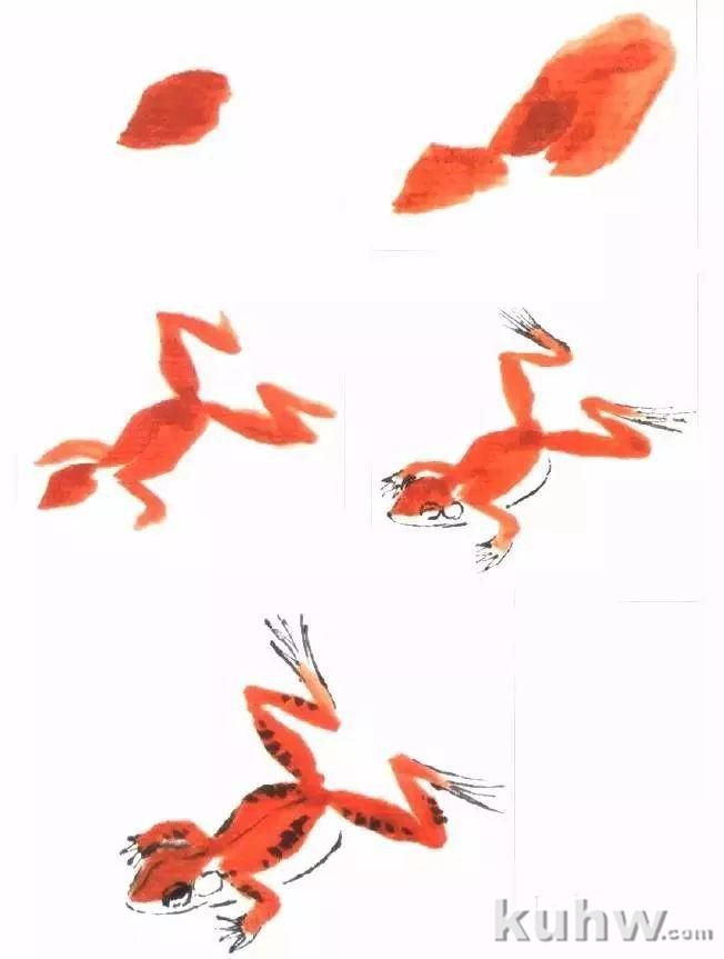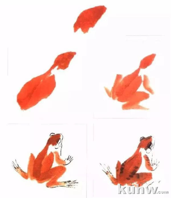 4.用淡墨画出青蛙的嘴、眼圈、气囊、胸腹及脚趾等。