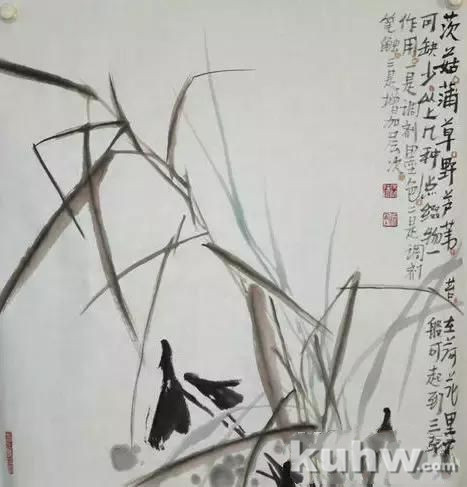 茨菇、蒲草、野芦苇、苔在荷花里不可缺少,以上几种点缀物一般可起到三个作用:调剂墨色、调剂笔触、增加层次。点缀物画好了可增加效果变化,画不好会破坏画面。因此,一幅荷花作品成也由它、败也由它,千万不可轻视。