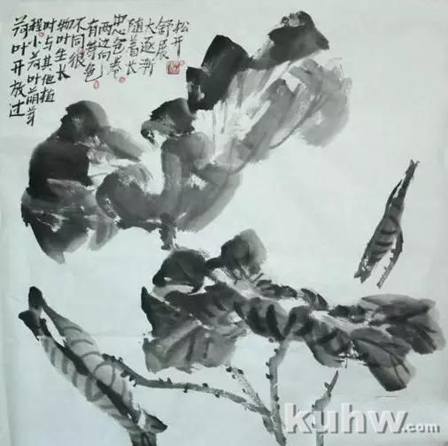 荷叶最易发挥写意画的笔墨效果,用大提笔或斗笔蘸水墨,侧锋卧笔挥写,酣畅淋漓。笔顺由外向里画,也可以从里向外画,要求边缘实、中心虚,叶脐附近多留空白。在掌握荷叶造型时,可“整而碎之,圆而方之”,目的以求变化、使其生动。