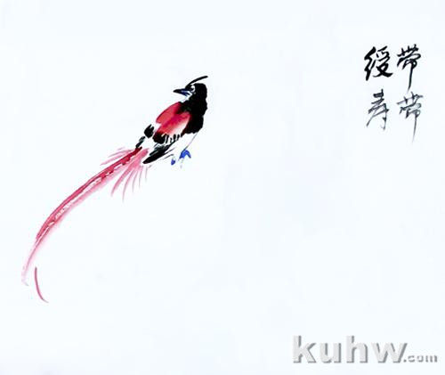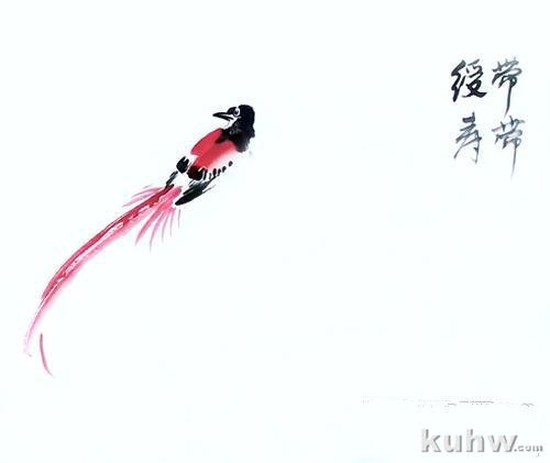 先画一只姿态背对的绶带鸟。先将毛笔调匀赭石色,再在毛笔尖处蘸曙红色调匀,可在笔尖处再蘸稍许墨。先画绶带的右翅副羽,再画左翅副羽。
