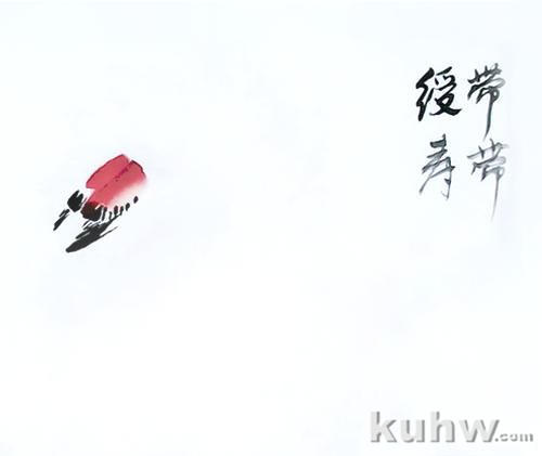 用树枝将两只鸟串到一起,然后再画鸟的爪。可用赭石色平衡画面,使画面舒服明朗。在笔尖处调和藤黄加赭石色为绶带鸟的眼睛上色,凸显出鸟的眼睛。