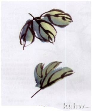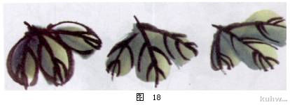 叶脉的勾法,因风格和各人习惯而异。可分三种勾法:一是较为严谨的勾法,主脉、侧脉都伸向叶尖;二是侧脉伸向叶缘,较松散随意;三是侧脉有聚散,作变形夸张,富有装饰味。不论何种勾法,均以中锋运笔(图18)。