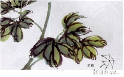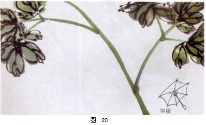 花有正侧偃仰背之分,叶子同样有俯仰正侧之别。写意画牡丹叶子,表现正反卷褶,不必像工笔画那样详尽,只侧重态势、气氛。由于叶片联叶柄,叶柄发自花茎,并向前后左右四面分布,叶与叶,叶与茎干之间,自然就会出现互相遮掩的现象,如前叶遮花茎,花茎遮后叶等。且由于远近的空间位置不同,在形象上还会产生透视变化,形成俯视、仰视、平视等不同姿式。犹如雨伞的不同角度变化(图19、20、21)。