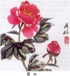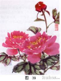 根据上述要领,具体入手时,以“一长一短,一大一小,一多一少,一纵一横”这十六个字的矛盾统一法则进行构图。如画两株花茎,应一高一矮,一壮一弱,不要平行等长,才有参差变化。两朵花的构图,花头不要一般大,应一大一小,以盛开花头为主体,另以花苞或初开花朵为陪衬。两花也不要平列或对称,要注意主宾和呼应(图38)。三朵花的构图,不要平均分散,要有聚有散(即一多一少),也不要平均、对称或形成一直线。以两朵紧靠,一朵散开,形成斜三角形布局为宜。在布局有聚散的同时,仍要注意花形的大小主次(图39)。多品种花的构图,即一幅画面有深浅不同或色相不同的花冠。可运用纵横交错布局,分两至三个层次,深浅花头互相衬托(图40)。