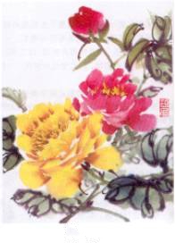 二、宾主呼应:画面只有主体花头,显得孤立单调,必须有体形较小的花苞或初放花头相衬托。布局上要顾盼呼应,才能体现牡丹的勃勃生机。