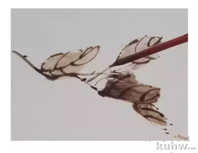 使用中号狼毫笔蘸取浓墨,中锋用笔勾画叶片的叶脉,并在枝条上点缀一些新芽,凸显生机之感。