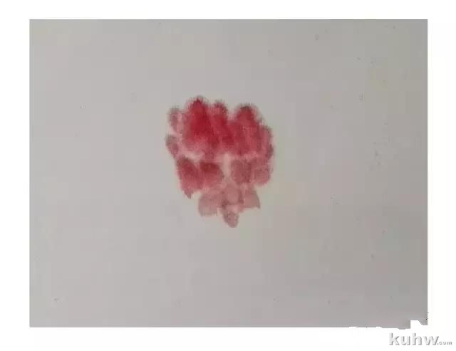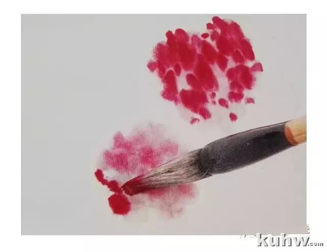 紧接着用中号羊毫笔蘸取曙红调和,色墨要实,中锋用笔点画上方荔枝表面的小点。
