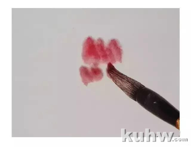 使用中号羊毫毛笔调和曙红与胭脂,再加水调和,中锋用笔点画荔枝。