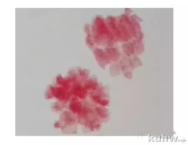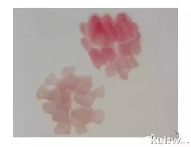 以羊毫笔笔尖调和曙红,色调不宜过浓,中锋用笔再点画一遍荔枝表面,让荔枝显得更加厚重。