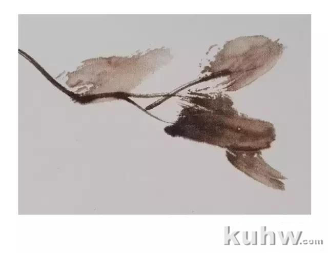 在绘制之前,要对画面构图有一个基本的构思,应对画面中事物的位置安排做到心中有数。首先采取由上至下出枝的方式,以中号狼毫笔蘸取淡墨勾画出枝干,并以中号羊毫笔调和淡墨,笔尖蘸浓墨,在枝间点画一些叶片丰富画面。