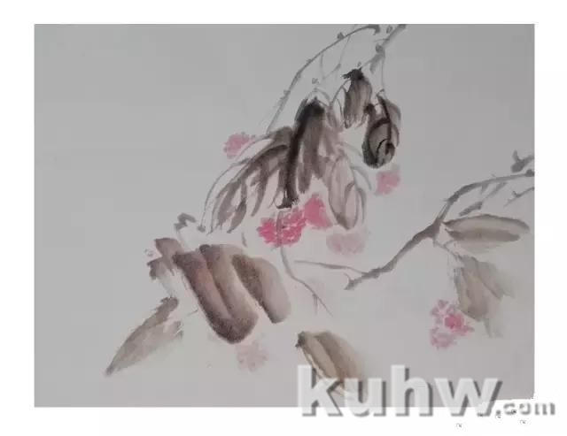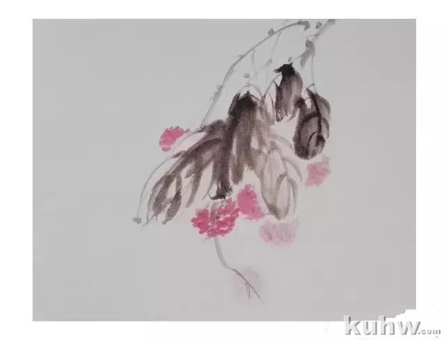 使用羊毫笔调和曙红和胭脂,加清调淡,色墨中加少许的花青,在下方再点画出一枚荔枝,以丰富画面。