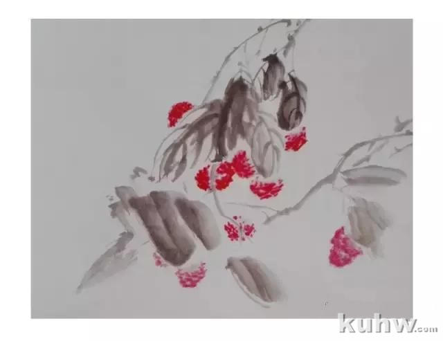 逐渐向下点画,荔枝的形态不宜过圆,点画时用笔可自由一些,突出写意之感。