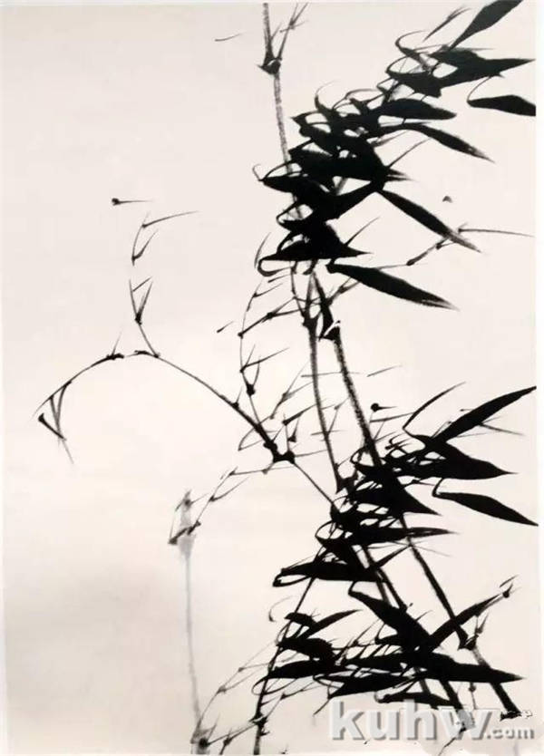 3、涮干净笔后,蘸适量清水,再蘸淡墨,笔尖饱蘸浓墨,尽量使笔上墨色由下至上为浓、淡、清,快速写风竹叶,直到一笔颜色全部用完再画下一笔。叶子墨色会出现自然的浓淡干湿变化。