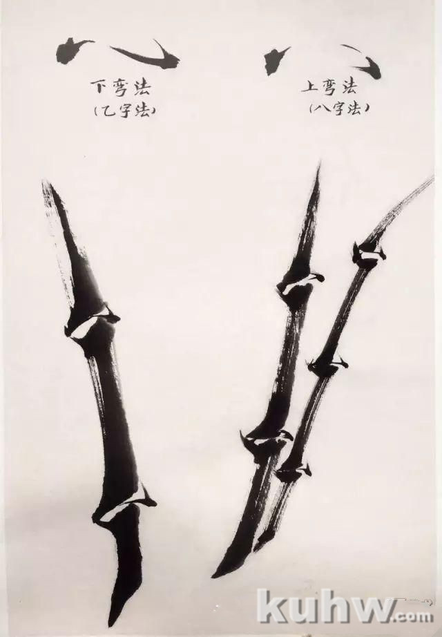 画节法古人分类归结起来,不外乎“上弯型”与“下弯型”两类,亦古人所讲八字法与乙字法。作者在画2米以上高度的竹竿时多在竹竿顶部用上弯法,底部用下弯法,以符合透视规律。