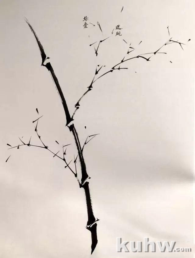 一般情况下,竿离地五节始生枝,竹枝为互生,画时须注意出枝的长度、方向。画枝要挺拔劲健,行笔要快,笔意连绵。枝上又生小枝,自内向外画的小枝,古人名之“迸跳”;自外向内画的小枝,古人名之“垛叠”。画时要兼而有之。竹节生枝不必节节出之,根据画面章法可省略。