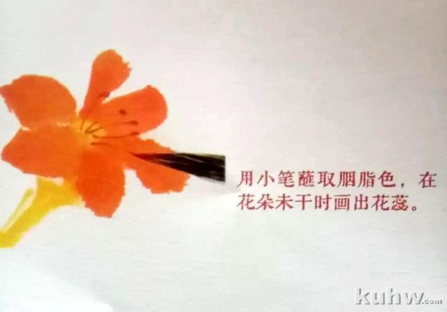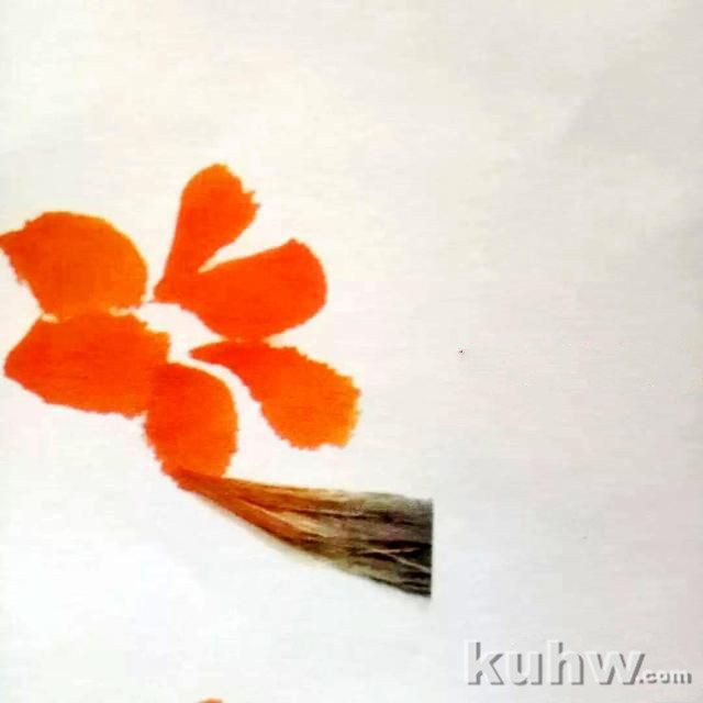 步骤1:用笔蘸取橙黄色直至笔根,笔尖蘸取朱 色调和,使其形成自然的渐变,画出正面与侧面的花瓣,再用藤黄色与橙黄色调和画出正面与侧面的花瓣,再用藤黄色与橙黄色调和画出花托部分。