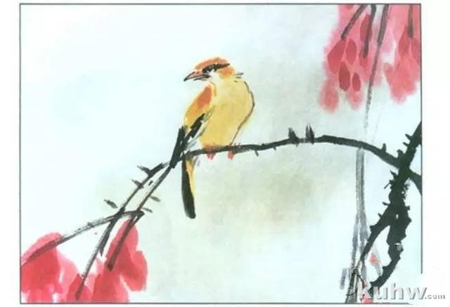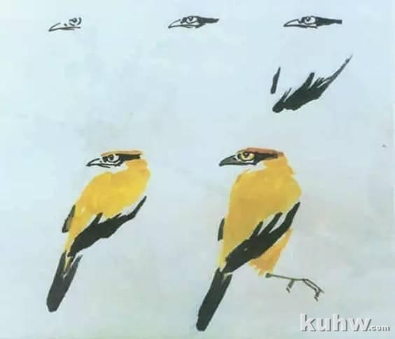 黄 鹂 的 画 法 : ( 1) 小 狼 毫 笔 勾 出 眼 、 嘴 ; ( 2) 眼 周 用 浓 墨 染 ; ( 3) 重 墨 画 出 飞 翅 ;( 4) 藤 黄 加 朱 砂 画 出 背 部 ; ( 5) 用 淡 藤 黄 画 腹 部 , 赭 石 勾 足 , 藤 黄 点 眼 睛 。