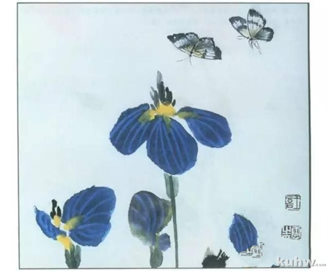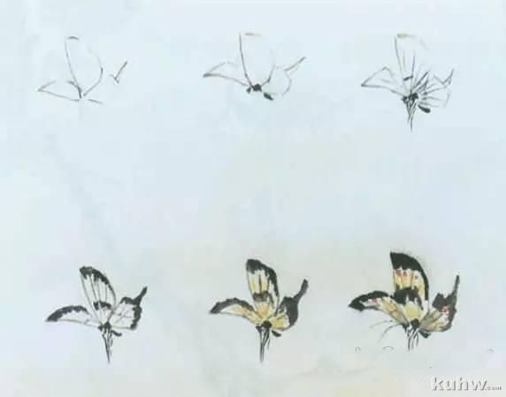 蝴蝶的画法:(1)小衣纹笔调淡墨画出翅膀;(2)重墨画出身体;(3)勾出六足;(4)浓墨画翅上花纹;(5)用藤黄略染;(6)用朱砂点花纹,小狼毫笔勾须。