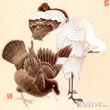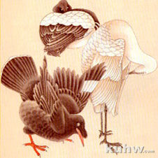 待染到预计的层次和浓淡效果时,用勾线笔勾出羽毛的细节。用白粉将八哥的脚爪分块染出鳞片状,将嘴、眼部的白色染出。用淡淡的橙黄色在八哥尾部和翅尖部轻轻罩染,再用花青从头部到背、腹部直至翅膀、尾巴轻轻罩染一遍,使其闪烁出荧荧的蓝光。用淡淡的白粉从鹭鸶和鹜雁白色羽毛的突出部位向凹陷部位轻轻罩染,使其整体统一。用淡淡的花青罩染鹭鸶的脚爪和嘴,最后点睛。