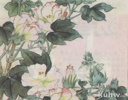 冲水、冲色法:冲水、冲色法(图二)是在墨线白描的基础上进行,其长处在于变化生动,偶有意想不到的效果。在表现像棉花、芙蓉花花脉比较明显的花卉时效果尤佳。棉花、芙蓉可在花瓣尖用红色向瓣根下染,汁绿则从瓣根向瓣尖染,趁邑尚未干时用白粉勾花脉,让白粉与原有底色自然渗化,待花干后再稍加修改。这时,花脉时隐(白粉融入底色之中)时现(白粉仍保持),变化丰富自然。画叶子也一样,用绿、深绿画好叶子,后用石绿、石青按画面需要冲入原底色中,使其自然渗化,特别是画小草及小菊花之类题材时用此方法效果更好。