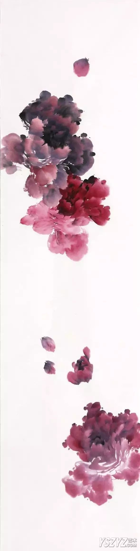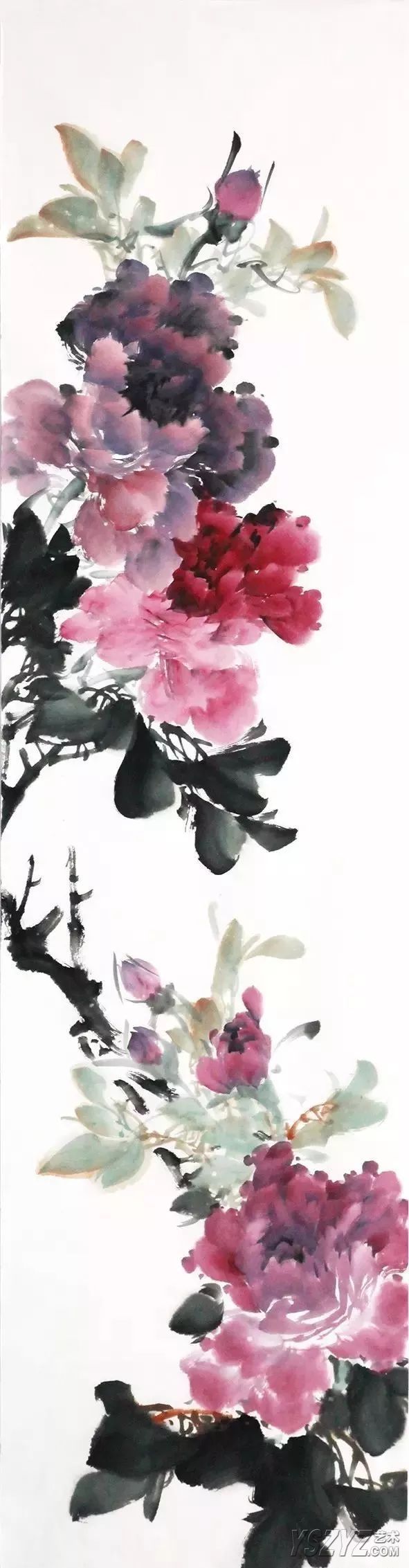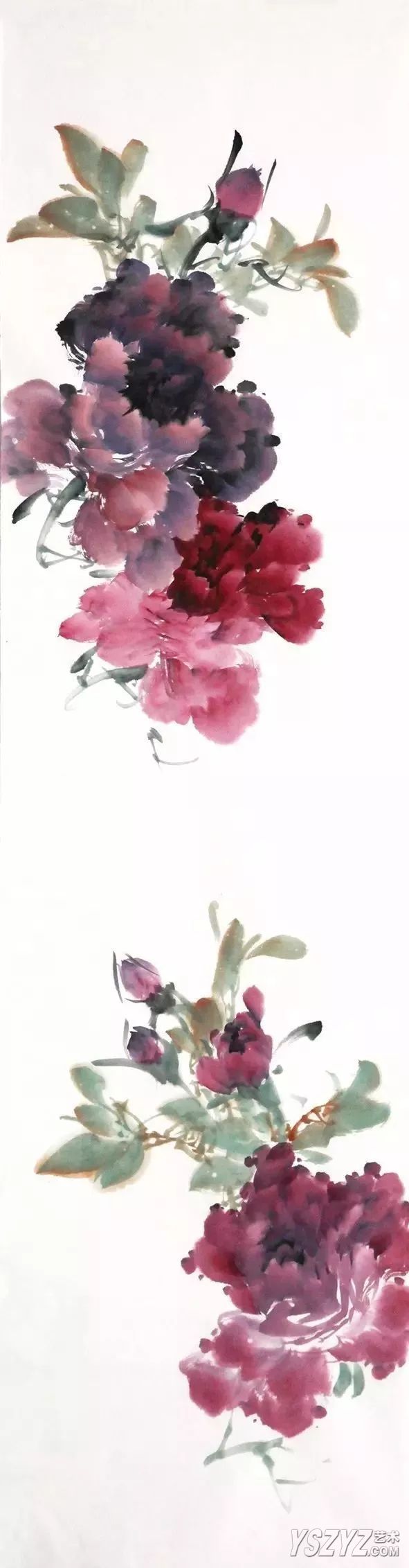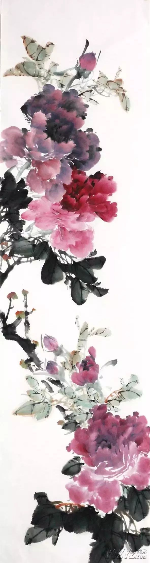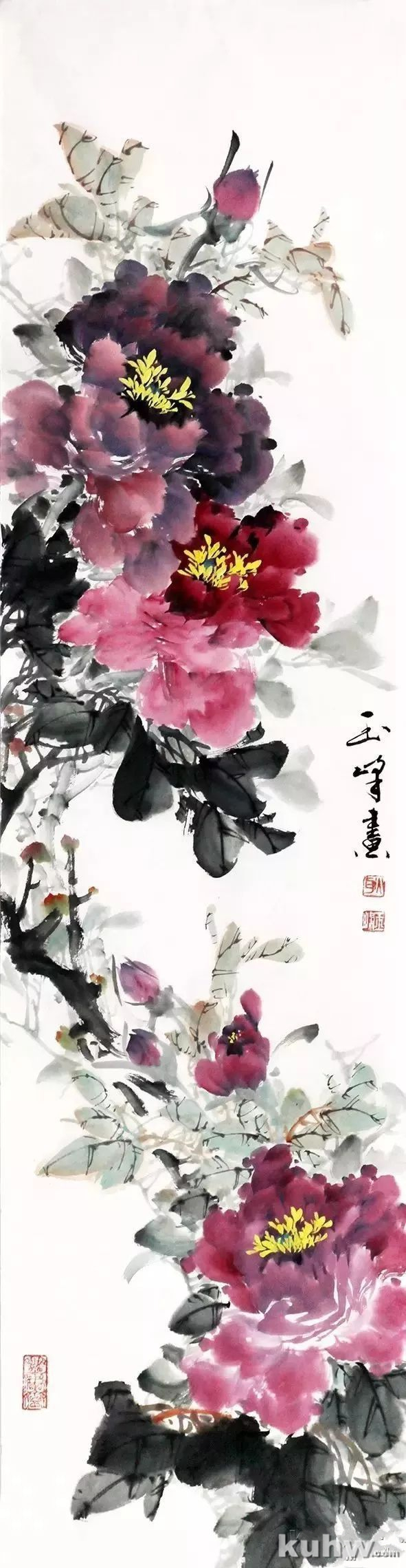 牡丹花头用二号、三号羊毫斗笔,上方深紫色花头用胭脂加墨,侧方花头曙红加少许墨,下方花头与上方花头颜色相同稍淡些,均以前淡后浓根据花型点写而成,注意花头的相互呼应及留出飞白。最后根据画面疏密点出花苞。