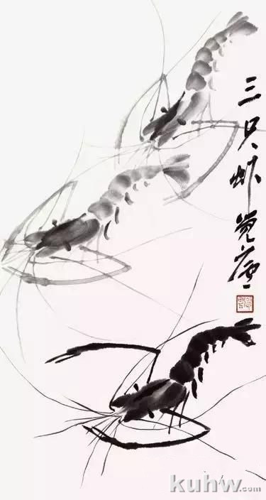 7. 浓墨画出头部的一笔,点出眼睛。画出细细的触须,要注意线条的弹性。