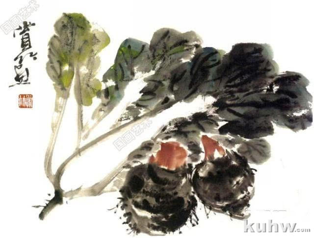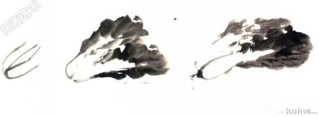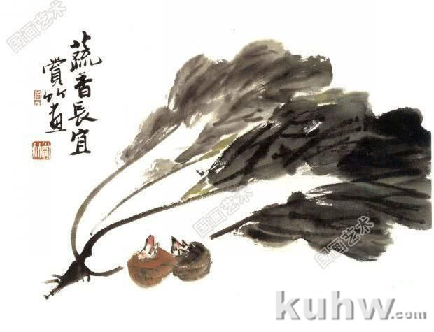 白菜的画法先以长锋羊毫大楷蘸中淡墨,中锋勾梗,行笔要沉着而流畅。然后用中号提笔蘸中墨,在盘中稍按几下,再蘸浓墨,依菜梗的外沿,由外向内运笔,画前面的叶片。中、淡墨画后面的叶片。半干时以长锋羊毫小楷勾浓墨筋,注意从密到疏,勾到近柄处时渐虚。中浓墨画根须。彩色白菜叶片,用青绿色蘸墨画, 根须也可以用赭墨色。