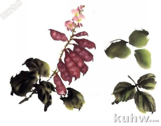 扁豆的叶子呈圆形,由三片组成一个单元,以小提笔蘸汁绿合墨画成,要注意透视变化。半干时用长锋羊毫小楷勾浓墨筋。