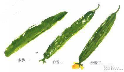 丝瓜的画法,长锋羊毫或长锋狼毫蘸汁绿,含水分要多些,二三笔即画成一条瓜,应带些飞白。然后调些花青或淡墨,使笔干枯,略勾擦一下,以表现丝瓜的粗糙感。藤黄蘸一点淡朱 ,由外向内画花瓣,中薄白色勾瓣筋,也可用汁绿色勾。