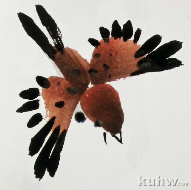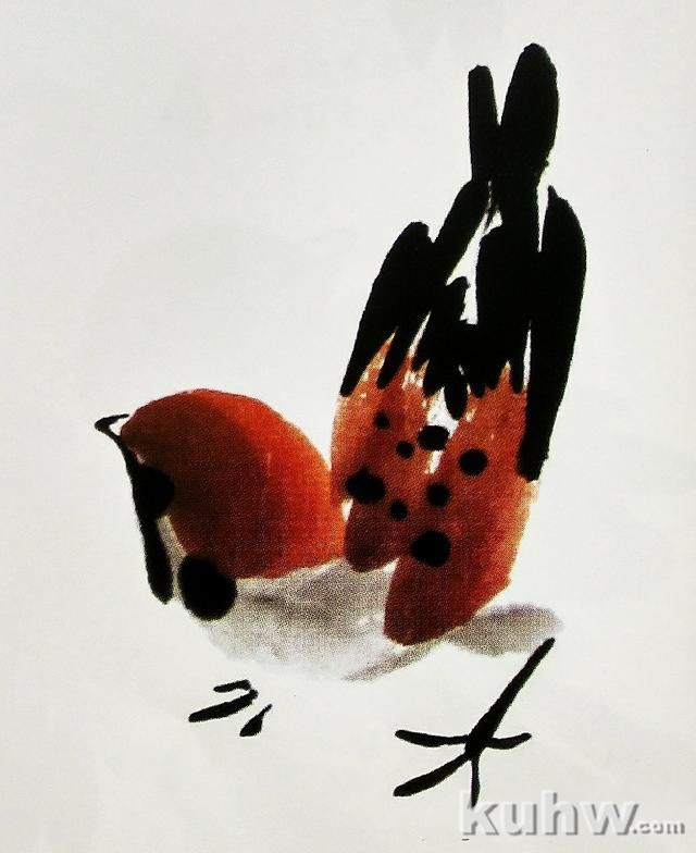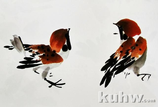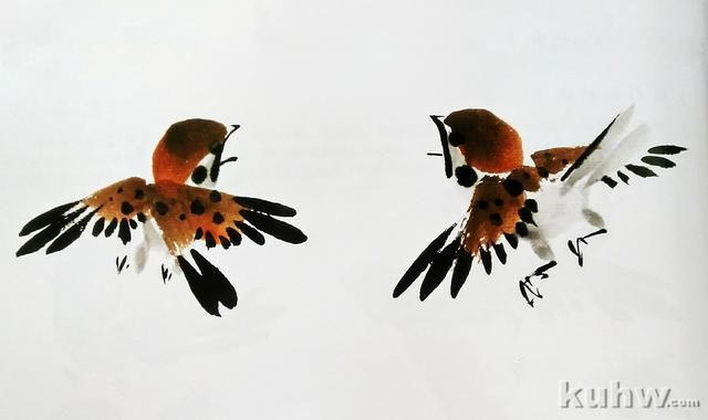 (3)蘸取浓墨,点画麻雀身体和翅膀上的斑纹,要有大小形态的变化,切忌呆板。